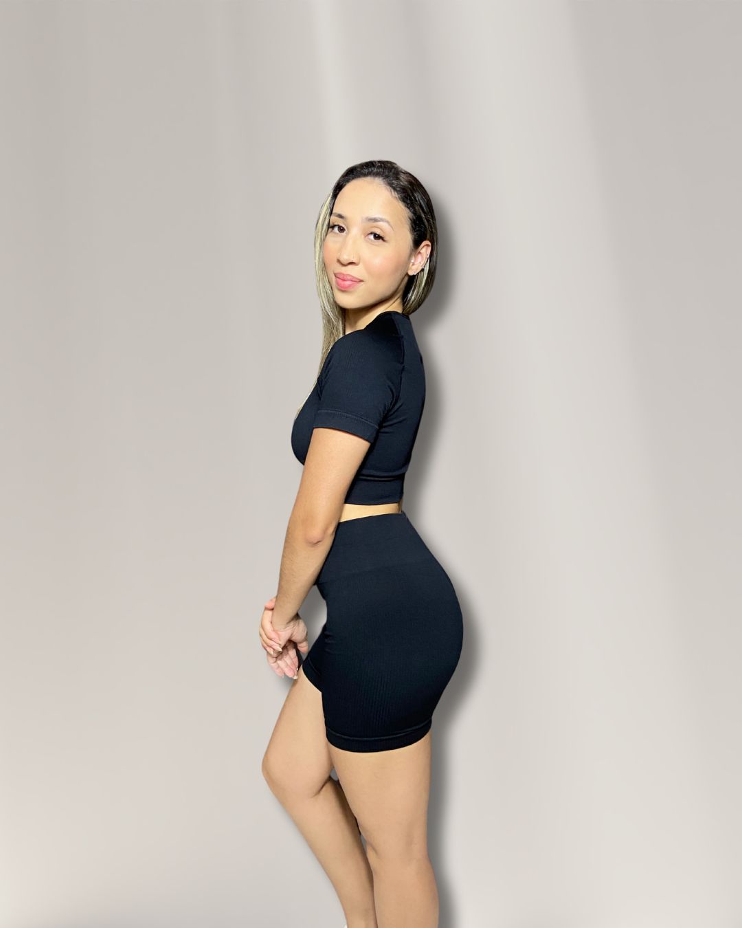 Conjunto Fitness Glow Power Preto Canelado – Top Manguinha e Short com Cós Alto e Zero Transparência